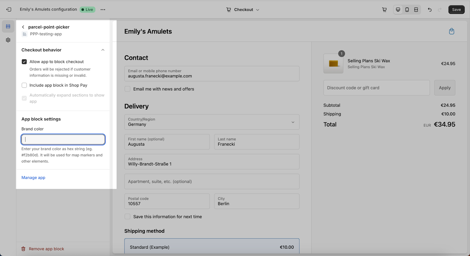 7.4 Aktivieren Sie die Option „Allow app to block checkout“, um sicherzustellen, dass Kunden ohne Auswahl eines Abholpunkts nicht fortfahren können. - Optional: Wählen Sie eine „Markenfarbe“, um die Elemente auf der Karte an das Erscheinungsbild Ihrer Marke anzupassen.