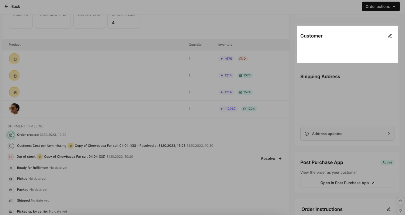 - Scrolle auf der Bestellseite nach unten, bis der Abschnitt „Customer and Shipping address“ auf der rechten Seite erscheint