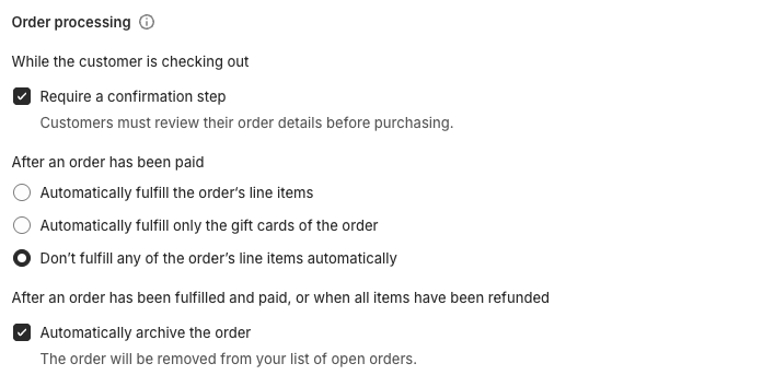 ⚠️ To ensure Hive fulfills your orders correctly, configure your Shopify order processing settings, at Settings → General → Order processing :