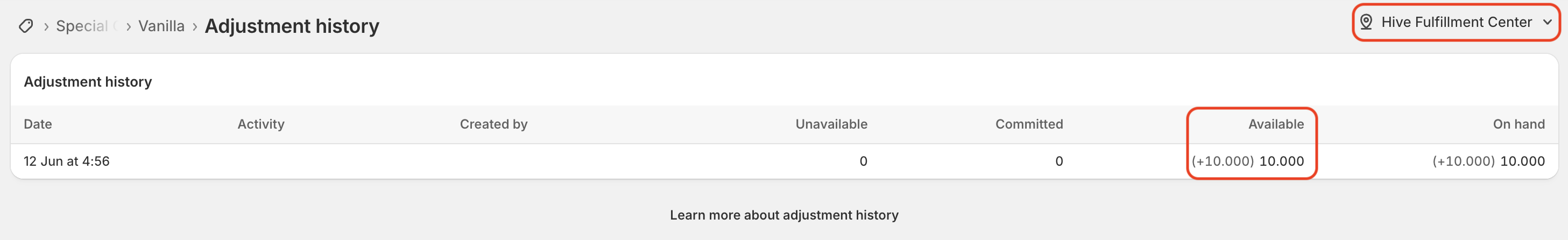 - In the “Adjustment history” page, select the “Hive Fulfillment Center” location (or the others, if your Brand is Pan-EU enabled).