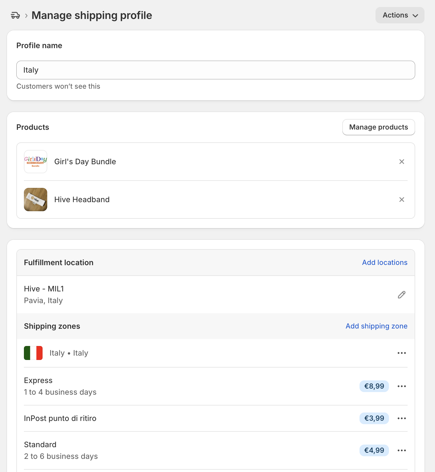 For example, create a custom shipping profile for your Italian customers to include Italy-specific shipping rates, and the Hive Fulfillment Center “Hive - MIL1”.