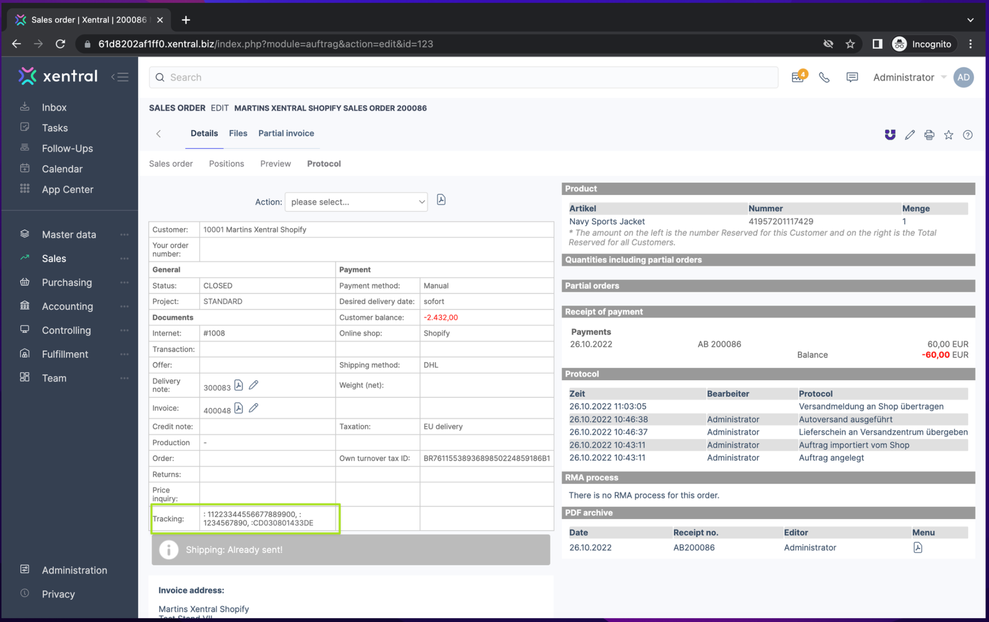 Tracking information is sent back to Xentral via API right after the order is processed and shipped by Hive. If multiple shipments are assigned to the order, multiple tracking numbers are passed on to the Xentral order.