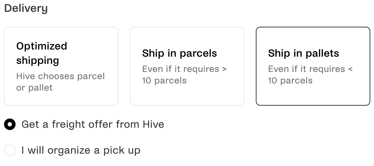 If you want your order to be packed on a pallet and shipped with our Freight services, and you are unsure if the order will be packed in 10 or more boxes, you can select on the order: "Ship in pallets" + "Get a freight offer from Hive"