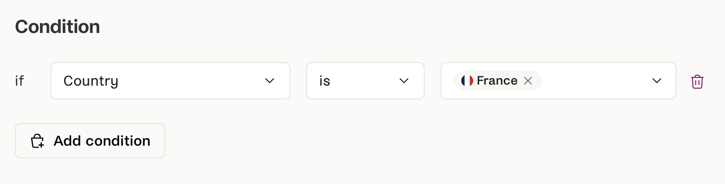 Incorrect: One rule with conditions “Destination = DE” AND “Destination = FR”