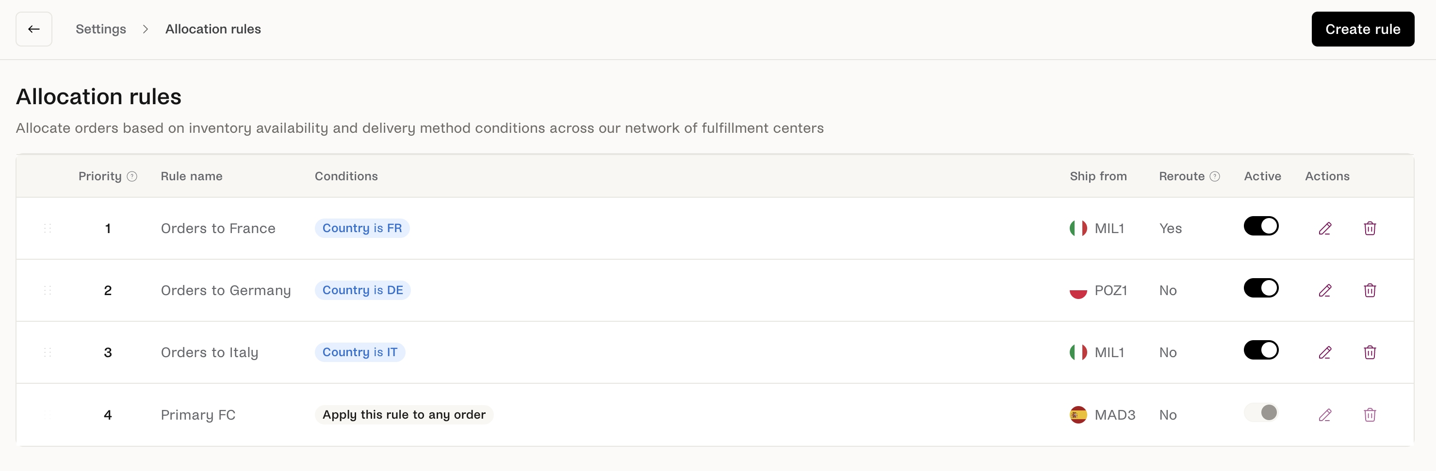 Allocation rules define how shipments are assigned to fulfillment centers. With clear rules and priorities in place, you can: