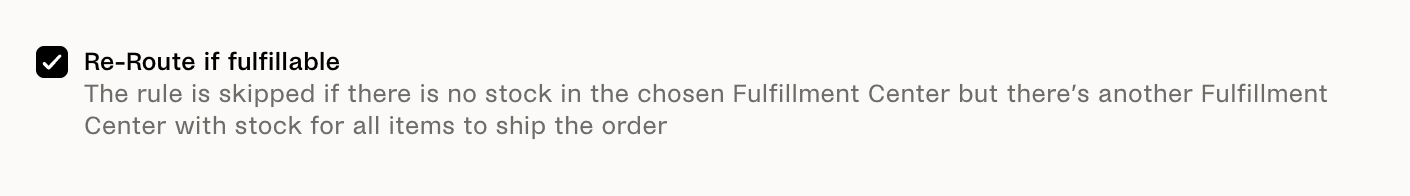 The Re-Route if fulfillable setting allows the system to skip a rule if the selected fulfillment center cannot fulfill the order due to lack of stock. This prevents orders from getting stuck at an out-of-stock fulfillment center, and ensures they are still shipped quickly if another fulfillment center can fulfill them in full.