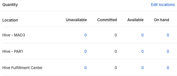 Ajustes manuales a las cantidades disponibles en las ubicaciones de Shopify de Hive (por ejemplo, Hive Fulfillment Center, Hive – BER3) serán sobrescritos automáticamente en un plazo de 60 minutos.