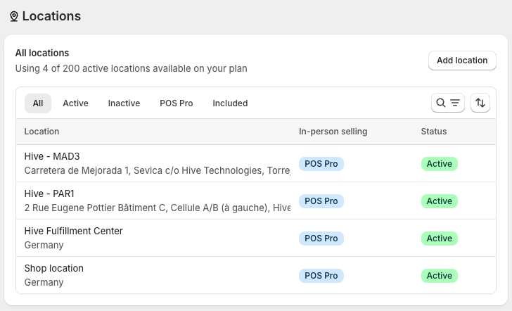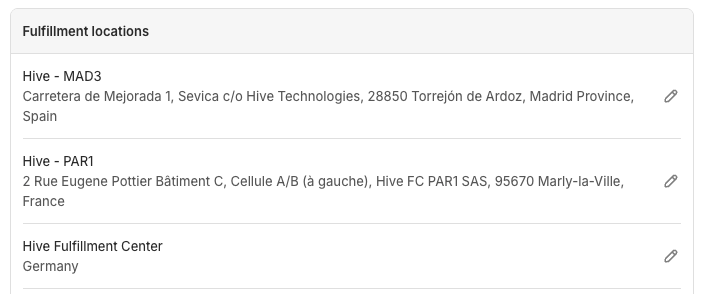 Para comerciantes que almacenan stock en múltiples centros de cumplimiento de Hive, crea nuevas ubicaciones en Shopify, basadas en tu configuración Pan-EU única.