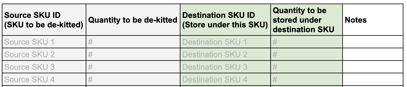 ¿Cómo puedo crear un nuevo pedido de de-kitting? Estamos trabajando para hacer el proceso de de-kitting mas fácil. Para esto, tenemos que estandarizarlo. Como resultado, todas las solicitudes de de-kitting tienen que enviarse utilizando la siguiente plantilla.