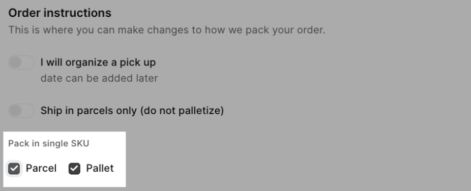 Indiquer si les boîtes ou les palettes doivent contenir un seul SKU dans la section des instructions de commande.