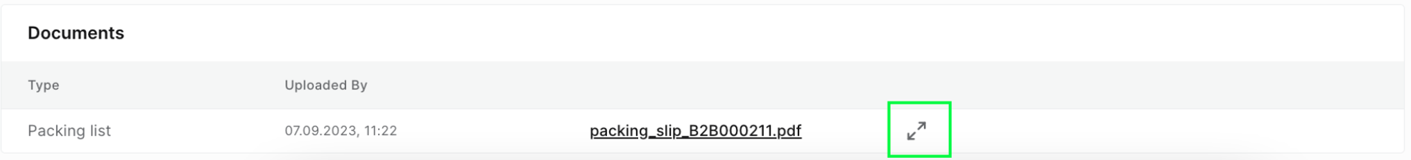 - Si la commande a été emballée, allez en bas de page de la commande. Vous trouverez, dans la section documents, un document type "Packing list" (liste de colisage). Cliquez sur les deux flèches à droite du nom du fichier.